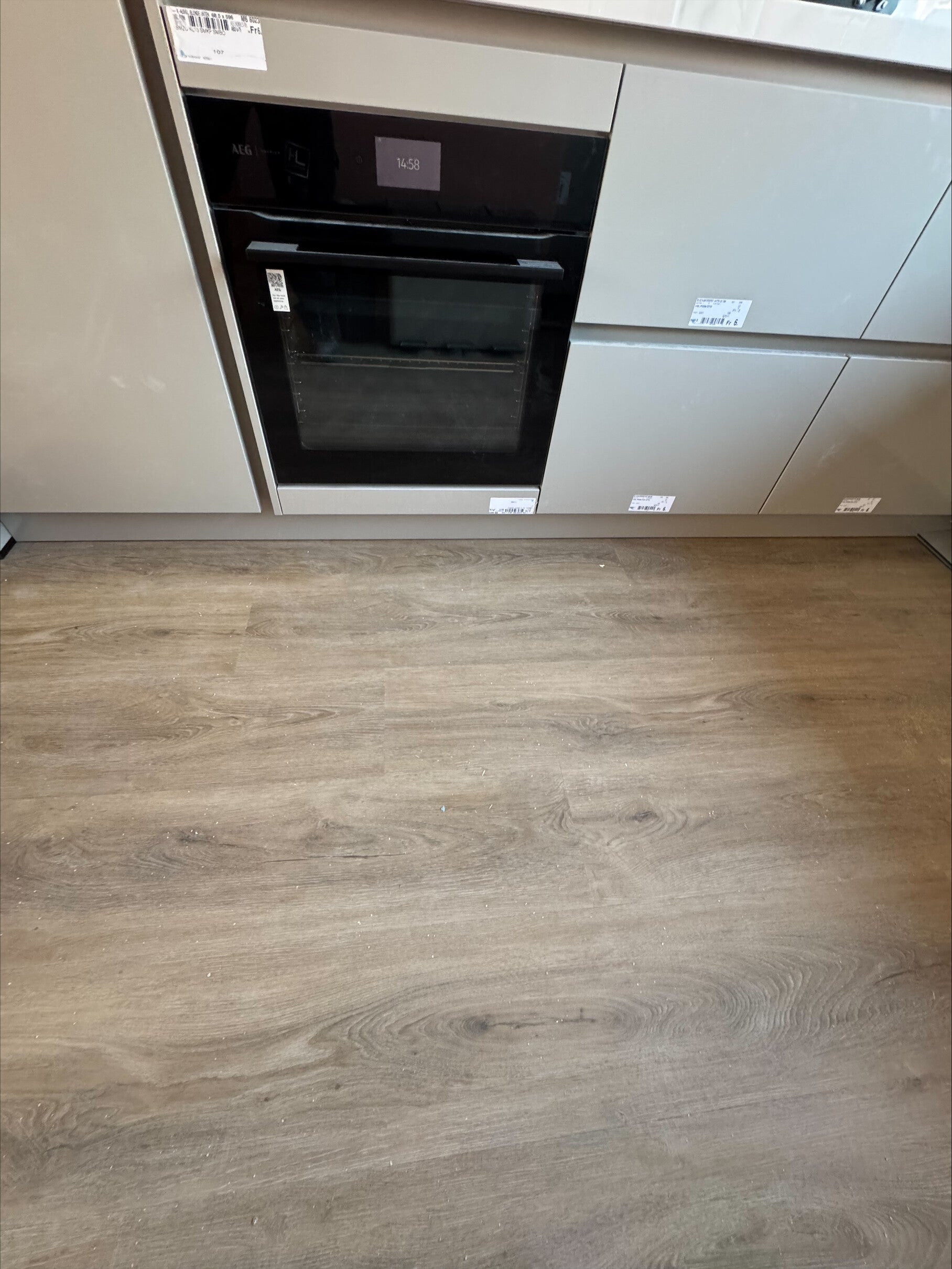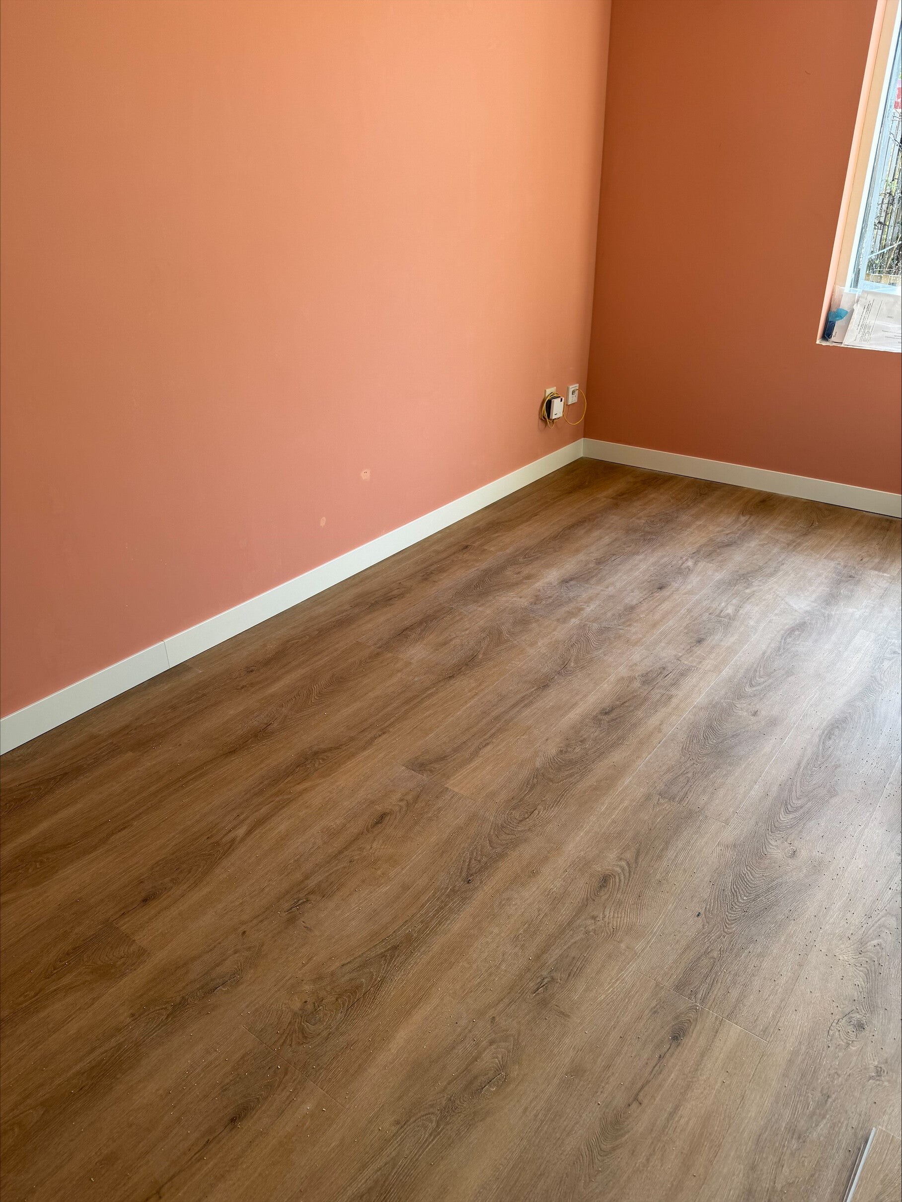 We hebben hier de PVC-vloer van PVCera gelegd in de kleur Lucca. Deze click-PVC vloer combineert een stijlvolle uitstraling met gebruiksgemak en is bovendien eenvoudig zelf te leggen. De plint hebben we uitgevoerd in een RAL9010 plint van 9 cm hoog.